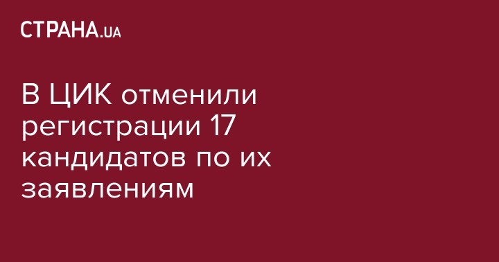 В понедельник, 8 июля, на заседании Центральной избирательной комиссии были рассмотрены заявления кандидатов в народные депутаты Украины в одномандатных избирательных округах, выдвинутых партиями и в порядке самовыдвижения, об отказе баллотироваться на выборы в Раду 21 июля, в результате чего были отменены регистрации 17 кандидатов. Об этом сообщает пресс-служба ЦИК.