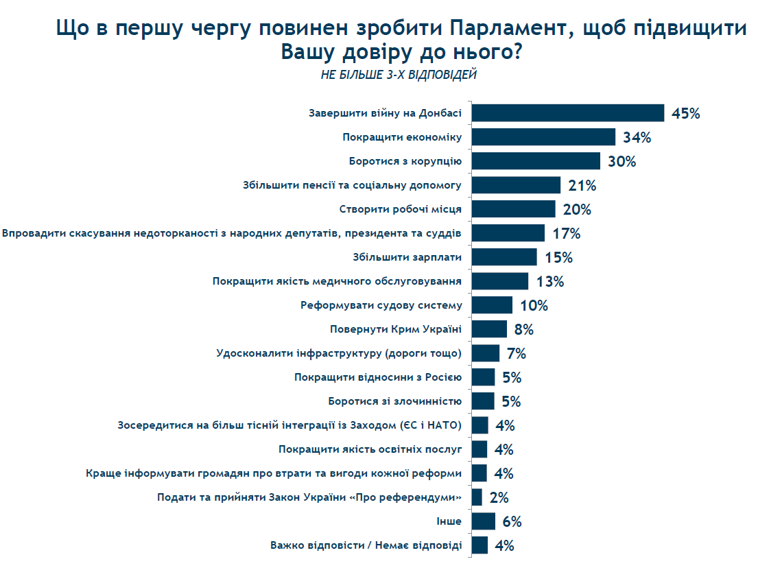 Социологи поинтересовались у респондентов, какие действия президента повысят доверие к нему и чего они ожидают от новоизбранной Рады. И от главы исполнительной власти, и от законодателей граждане Украины ожидают в первую очередь завершения войны на Донбассе (65 и 45% соответственно), улучшения экономики (39 и 34%), борьбы с коррупцией (33 и 30%), а также создания рабочих мест и увеличения пенсий и соцвыплат (около 20% голосов).