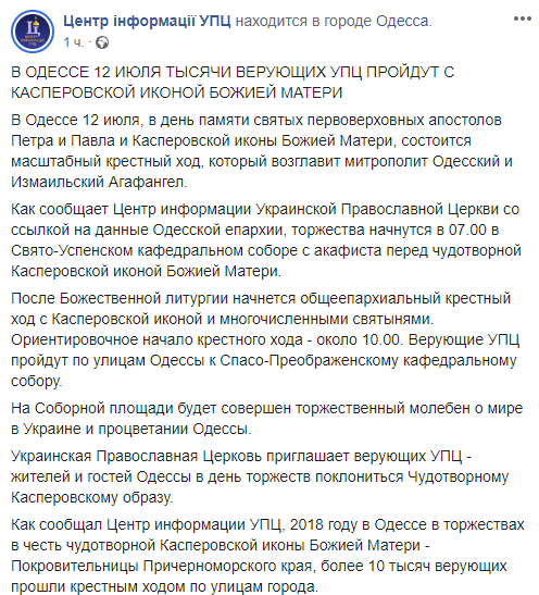 Уточняется, что торжества начнутся в 07?00 в Свято-Успенском кафедральном соборе с акафиста перед чудотворной Касперовской иконой Божией Матери. Затем, около 10:00, после Божественной литургии начнется общеепархиальный крестный ход с Касперовской иконой и другими  святынями. Планируется, что верующие УПЦ пройдут по улицам Одессы к Спасо-Преображенскому кафедральному собору.