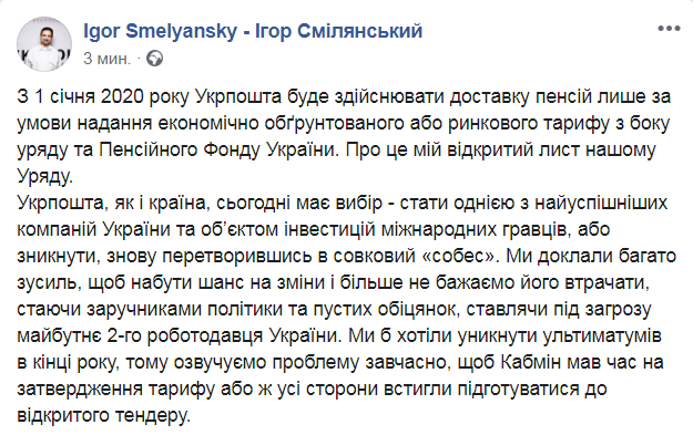 С 1 января 2020 "Укрпочта" будет доставлять пенсии, только если правительство и Пенсионный фонд Украины назначат экономически обоснованный или рыночный тариф на эту услугу. Такое условие поставил генеральный директор компании Игорь Смелянский в открытом письме на своей странице в Facebook.