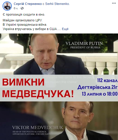 "Есть предложение сходить в кино. Майдан организовало ЦРУ. В Украине гражданская война. Украина вмешивалась в выборы в США. Путин – миротворец и не виноват. Медведчук вообще топ-менеджер, и мы должны извиниться перед Россией и создать с ней союз.