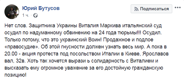 "Защитника Украины Виталия Маркива итальянский суд осудил по надуманному обвинению на 24 года тюрьмы!!! Осудил. Только потому, что это украинский Воин! Продажное и подлое "правосудие". Об этой гнусности должен узнать весь мир. А пока в 20:00 - акция протеста под посольством Италии в Киеве, Ярославов вал, 32в. Хоть так хочется выразить солидарность с Виталием и высказать ему огромное уважение за его достойную гражданскую позицию!" - написал Бутусов.