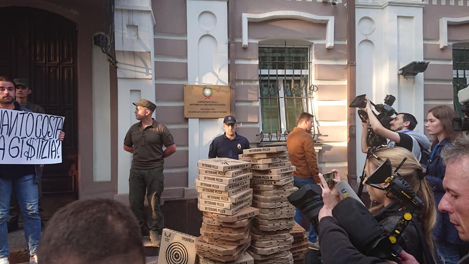 Участники акции протеста принесли под посольство Италии 24 пустые коробки из-под пиццы и баннер с надписью "FreeMarkiv"и оставили их у порога диппредставительства.