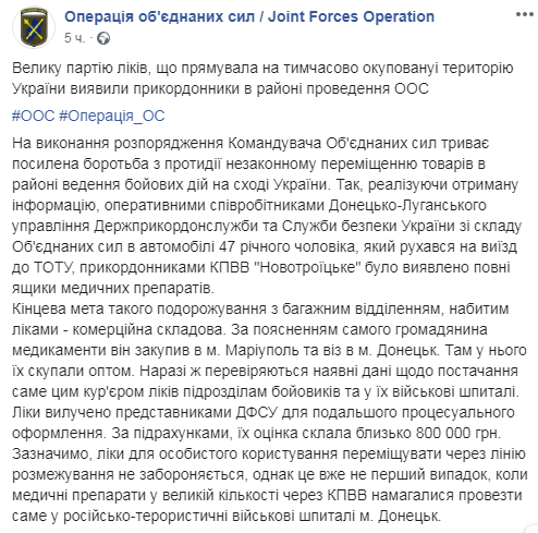 В штабе отметили, что перевозить лекарства для личного пользования в ООС не запрещается. Однако в этом случае партию изъяли.