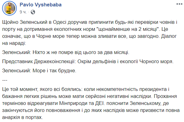 "Только что Зеленский в Одессе поручил прекратить любые проверки лодок и порта на соблюдение экологических норм "минимум на 2 месяца". Это означает, что в Черное море теперь можно сливать все, что угодно.