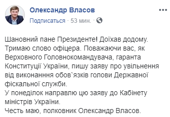 "Уважаемый господин президент! Доехал домой. Держу слово офицера. Уважая вас, как Верховного Главнокомандующего, гаранта Конституции Украины, пишу заявление об освобождении от исполнения обязанностей председателя Государственной фискальной службы", - говорится в сообщении.