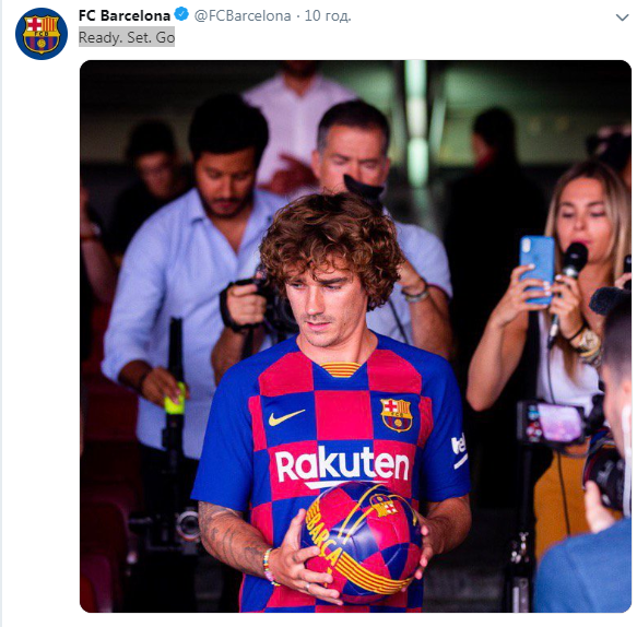 Фото француза в новой форме Барсы на сезон 2019/2020 появились в официальном Twitter команды. Антуан Гризман запечатлен в клетчатой футболке и с мячом в фирменных цветах клуба.