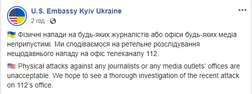 "Физические нападения на журналистов или офисы любых медиа недопустимы. Мы надеемся на тщательное расследование недавнего нападения на офис телеканала "112", - заявили американские дипломаты.