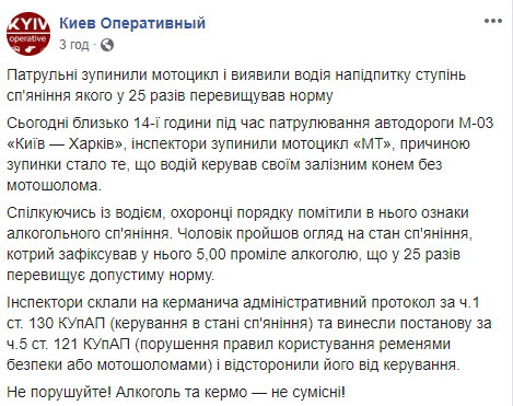 В понедельник, 15 июля, около 14 часов во время патрулирования автодороги М-03 "Киев - Харьков", инспекторы полиции остановили мотоцикл "МТ". Причиной остановки стало то, что водитель управлял своим железным конем без мотошлема. Об этом пишет  Киев оперативный.