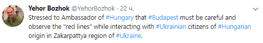"Подчеркнул послу Венгрии, что Будапешт должен быть осторожным и придерживаться "красных линий" при взаимодействии с украинскими гражданами венгерского происхождения в регионе Закарпатья", - написал Божок в Twitter.