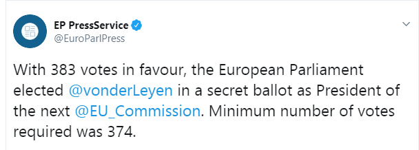 Министр обороны Германии Урсула фон дер Ляйен избрана председателем Европейской комиссии. За нее проголосовали 383 депутатов при необходимых 374.