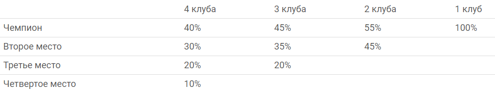 Половина суммы, соответствующей ценности каждого телерынка, будет поделена между клубами в зависимости от результатов в предыдущем национальном чемпионате. Ниже приведена схема распределения.