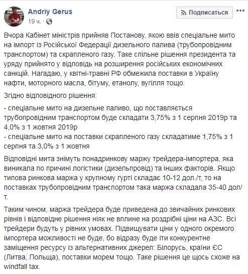 Андрей Герус отметил, что совместное решение президента и правительства о введении спецпошлины было принято в ответ на расширение российских экономических санкций. Он напомнил, что в апреле-мае РФ ограничила поставки в Украину нефти, моторного масла, битума, этанола, угля. Согласно решению украинского правительства, специальная пошлина на дизельное топливо составит с 1 августа 3,75% (с 1 октября - 4%), а на сжиженный газ - 1,75% (с 1 октября - 3%).