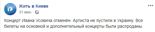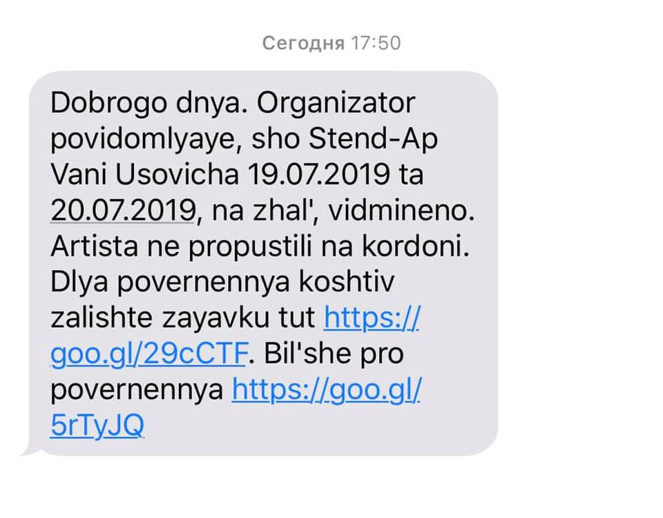 "Организатор сообщает, что стенпад Вани Усовича 19.07.2019 и 19.07.2019, к сожалению, отменен. Артиста не пропустили на границе", говорится в сообщении.