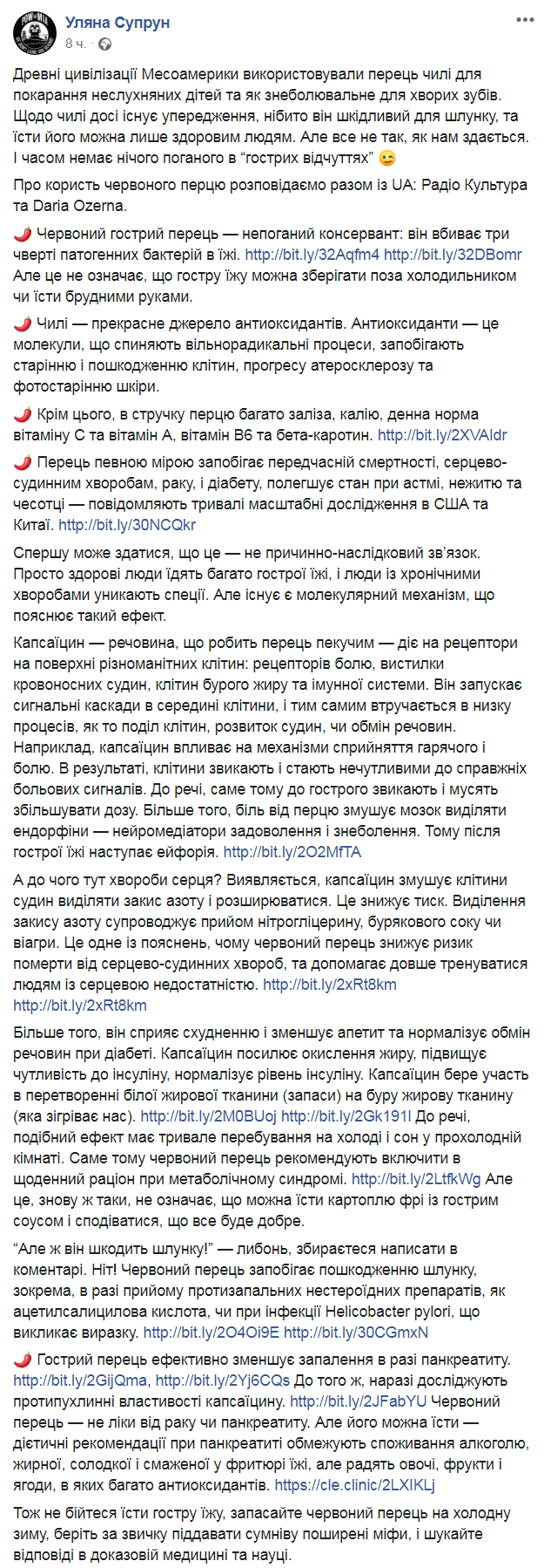 И.о. министра здравоохранения Украины Ульяна Супрун поведала о том, что перец чили содержит много полезных веществ и способен предотвратить некоторые тяжелые заболевания. Посвященный перцу пост она разместила на своем Facebook.
