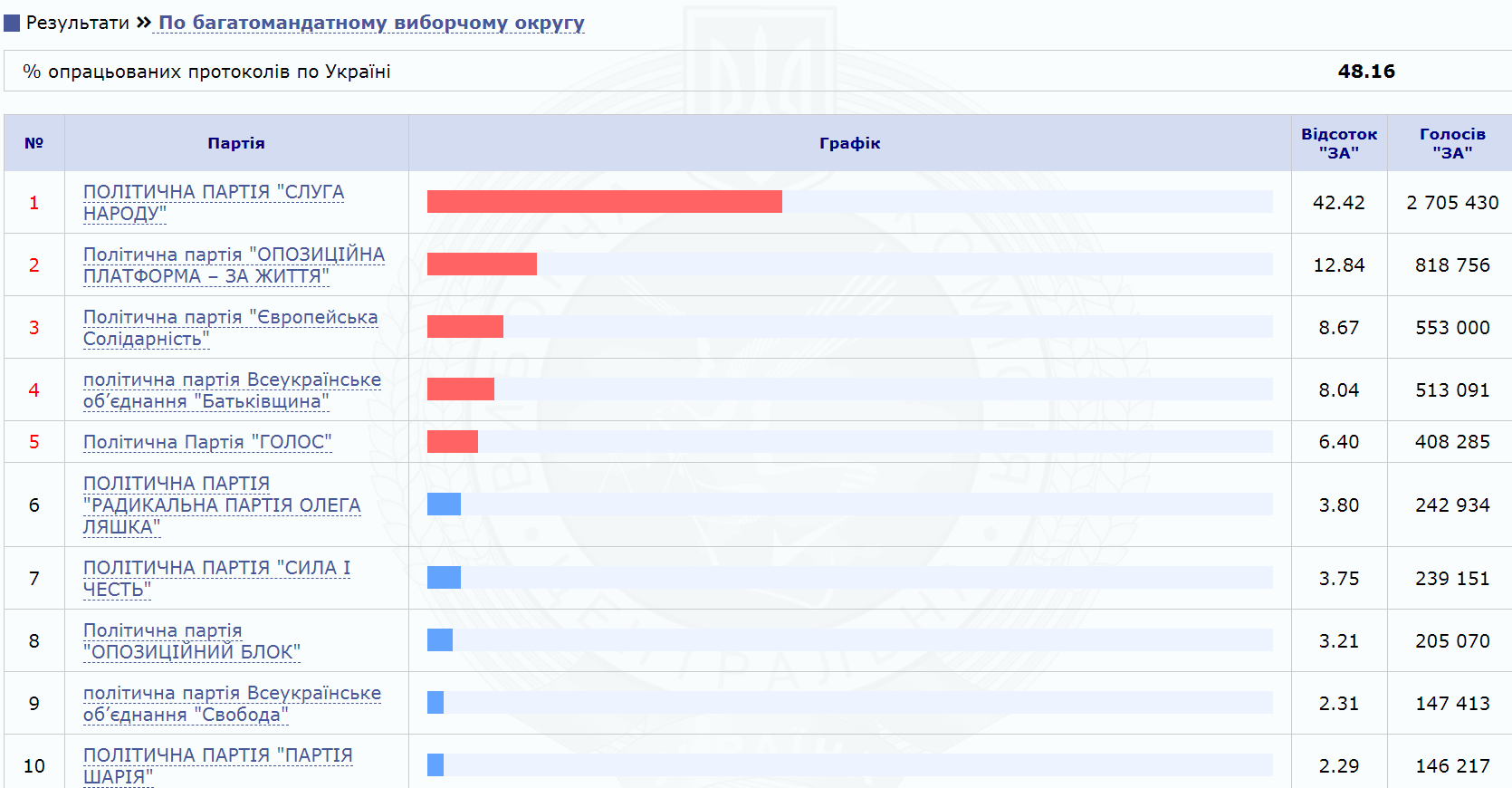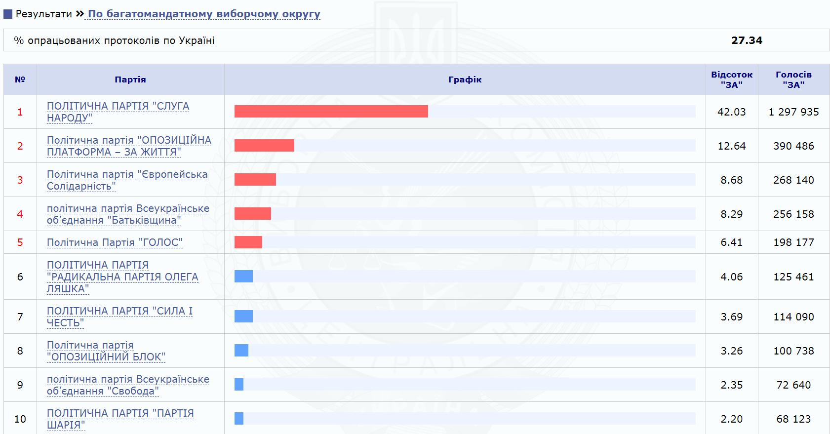 Партия "Слуга народа" набрала 43,11% голосов избирателей, "Оппозиционная платформа - За жизнь" - 13,03%. "Европейская солидарность" набирает 8,15%, а ВО "Батькивщина" - 8,18%. У партии "Голос" Вакарчука - 5,87%.