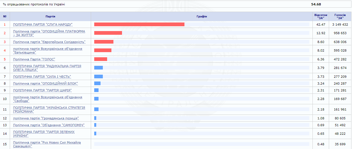 12.00 Обработано 54,68% бюллетеней. У "Слуги народа" - 42,47%, у "Оппозиционной платформы" - 12,92%, "Европейская солидарность" - 8,6%, Батькивщина - 8,02%, Голос - 6,36%.