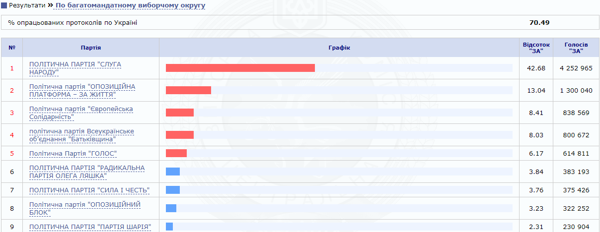 Согласно большинства рейтингов, 5%-ный барьер преодолевали четыре политсилы: "Слуга народа", "Оппозиционная платформа - За жизнь", "Батькивщина", "Европейская солидарность". Под вопросом была партия Вакарчука "Голос".