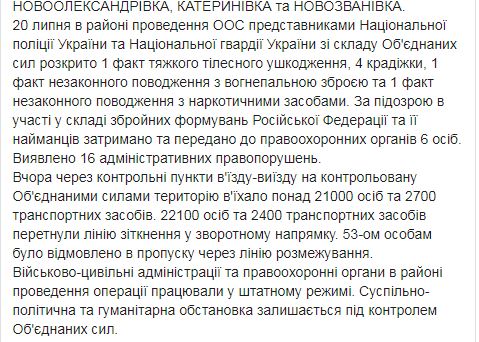 Договоренность о прекращении огня в Донецкой и Луганской областях с 00.01 21 июля была достигнута 17 июля на заседании в Минске Трехсторонней контактной группы. В утренней сводке штаба ООС указывалось, что с начала суток обстрелы не зафиксированы. Позднее пришло сообщении о подрыве в районе города Счастье (Луганской области) на взрывном устройстве, установленном диверсантами, четырех украинских бойцов. Двое из них погибли.