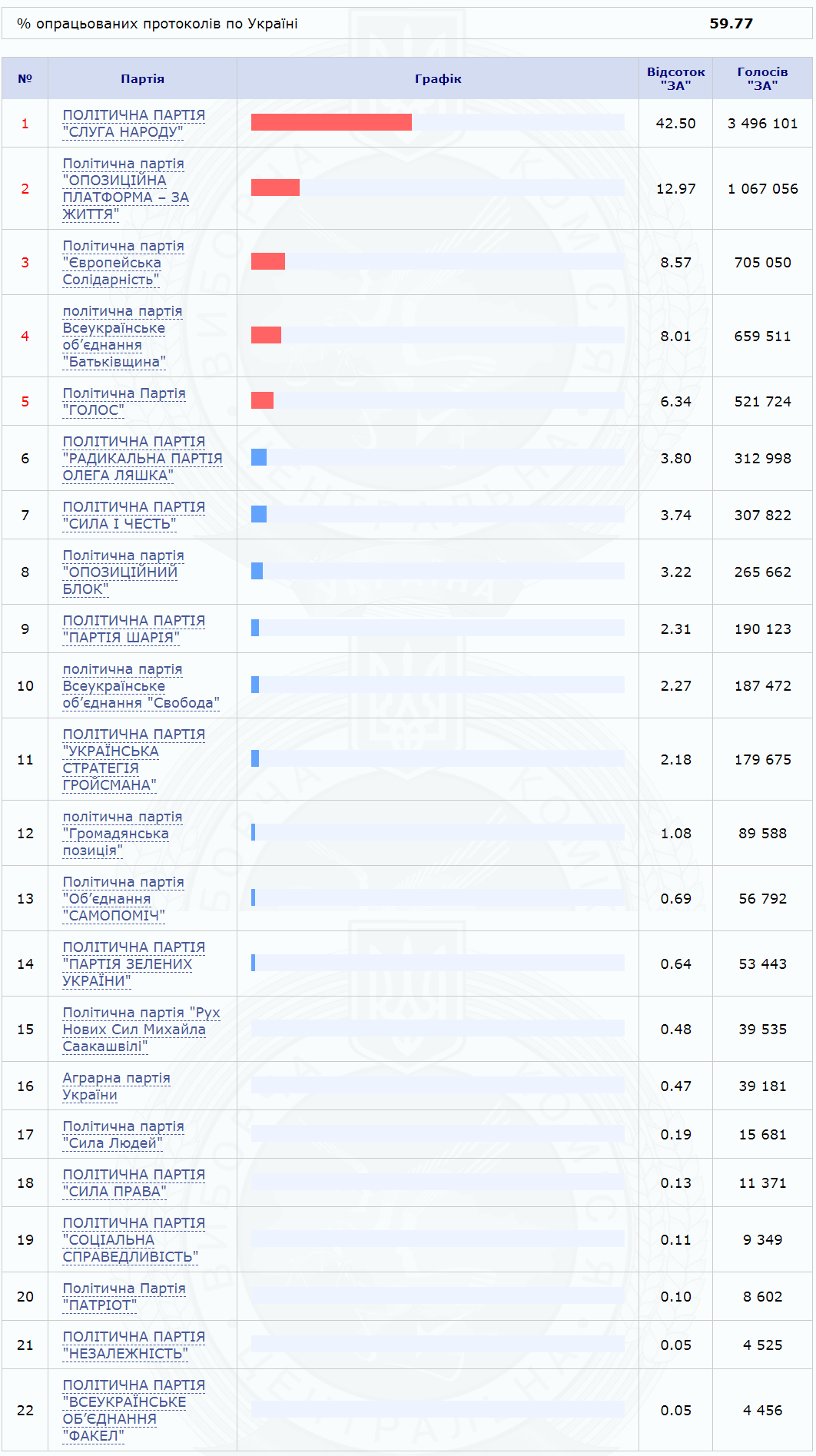 По состоянию на 13:10, 22 июля, ЦИК обработала 59,77% протоколов. По результатам голосования в Верховную Раду проходят 5 политсил. Сводную таблицу результатов ЦИК обнародовала на официальном сайте.