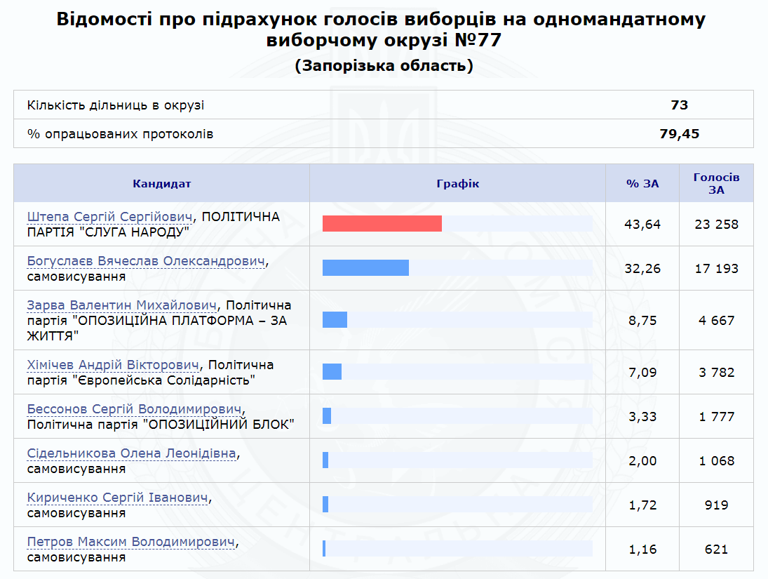 В 77-м избирательном округе в Запорожье народный депутат четырех созывов Вячеслав Богуслаев уступает кандидату от "Слуги народа" Сергею Штепе. Такие данные по результатам обработки 79,45% протоколов приводит сайт Центральной избирательной комиссии.