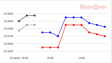 Межбанк вчера закрылся с котировками 25,65 (покупка) и 25,67 (продажа). То есть за 22 июля доллар подешевел на 5 копеек. Сегодня торги стартовали с 10:00.