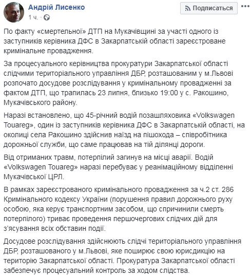В рамках зарегистрированного уголовного производства по ч.2 ст. 286 Уголовного кодекса Украины (нарушение правил дорожного движения лицом, управляющим транспортным средством, повлекшее смерть потерпевшего) продолжается проведение первоочередных следственных действий для выяснения всех обстоятельств происшествия. Его ведут сотрудники львовского территориального управления ГБР под процессуальным наблюдением прокуратуры Закарпатья.