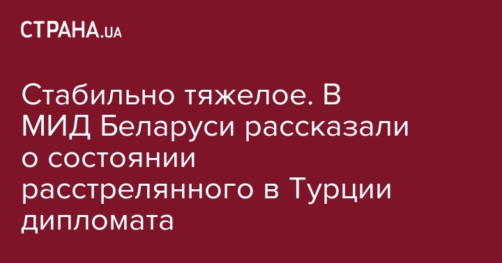 Советник-посланник посольства Беларуси в Турции Александр Поганшев, которого вчера, 24 июля, расстреляли прямо на улице Анкары, после проведенной экстренной операции находится в тяжелом состоянии. Об этом ТАСС сообщил пресс-секретарь МИД Белоруссии Анатолий Глаз.