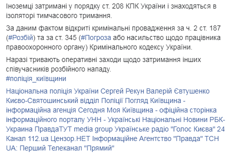 Граждане Грузии задержаны и находятся в изоляторе временного содержания. По данному факту возбуждены уголовные производства по ч. 2 ст. 187 (разбой) и по ст. 345 (Угроза или насилие в отношении работника правоохранительного органа) Уголовного кодекса Украины.