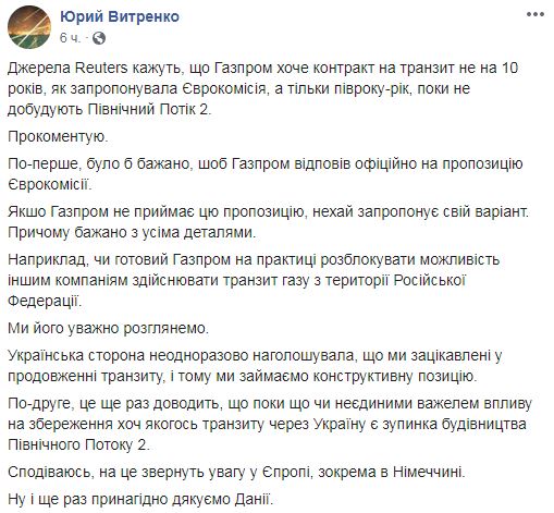 Также новость о коротком контракте прокомментировал исполнительный директор "Нафтогаза" Юрий Витренко. "Во-первых, было бы желательно, что Газпром ответил официально на предложение Еврокомиссии. Если Газпром не принимает это предложение, пусть предложит свой вариант. Причем желательно со всеми деталями. Например, готов ли Газпром на практике разблокировать возможность другим компаниям осуществлять транзит газа по территории Российской Федерации. Мы его внимательно рассмотрим. Украинская сторона неоднократно подчеркивала, что мы заинтересованы в продолжении транзита, и поэтому мы занимаем конструктивную позицию", - написал он в Facebook.