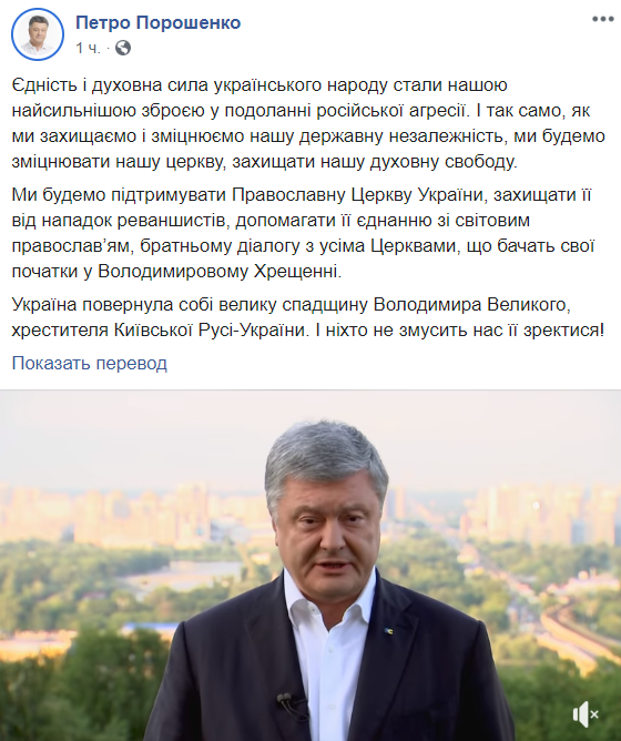 На Facebook Порошенко есть сразу два поздравления с днем Крещения Руси, одно из которых - видеообращение. Но записано оно явно заранее.