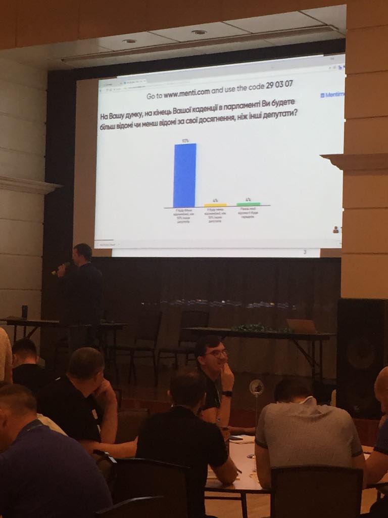 Ряд вопросов касался ожиданий депутатов от их будущей работы. Например: "По вашему мнению, к концу вашей каденции в парламенте вы будете более известны или менее известны за свои достижения, чем другие депутаты?" И, судя по ответам, большинство присутствующих считают, что затмят своих коллег.