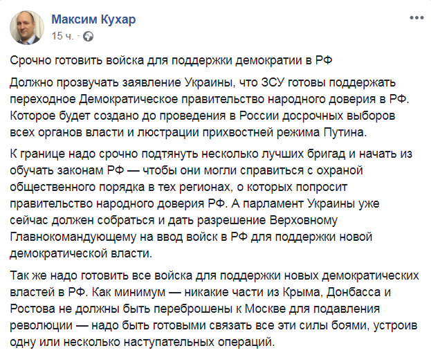 По словам журналиста, Украина должна заявить, что ее вооруженные силы готовы поддержать "переходное Демократическое правительство народного доверия в РФ". По мнению Кухара, такое правительство будет создано до проведения в России досрочных выборов всех органов власти и люстрации "прихвостней режима Путина".