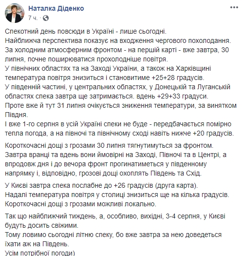 С 1 августа во всей Украине жары не будет - предполагается умеренно теплая погода, а на севере и северо-востоке даже ниже +20 градусов, сообщила синоптик Наталья Диденко в своем Facebook. Ближайшая неделя, а особенно выходные, 3-4 августа, в Киеве будут достаточно свежими, добавила она.