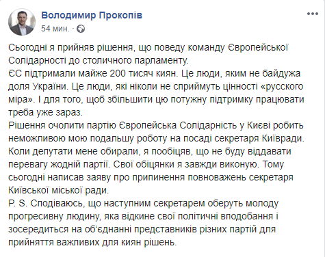 "Сегодня я принял решение, что поведу команду "Европейской солидарности" в столичный парламент… Решение возглавить партию "Европейская солидарность" в Киеве делает невозможной мою дальнейшую работу на должности секретаря Киевсовета… . Поэтому сегодня написал заявление о прекращении полномочий секретаря Киевского городского совета", - написал Прокопив.