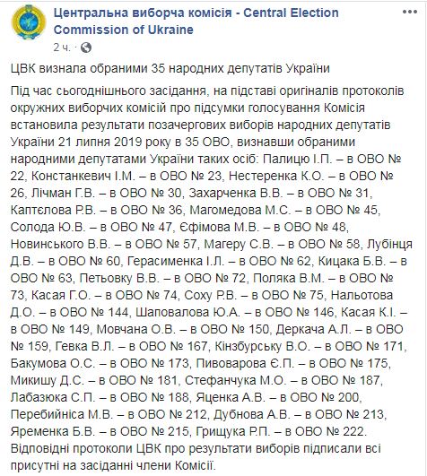 Отмечается, что на основании оригиналов протоколов окружных избирательных комиссий об итогах голосования Комиссия установила результаты внеочередных парламентских выборов 35 окружкомов, признав избранными народными депутатами Украины 35 человек, в том числе главу Волынского областного совета Игоря Палицу, самовыдвиженцев (и действующих нардепов) Василия Петёвку, Андрея Деркача и Антона Яценко, а также представителей партии "Слуга народа" Максима Перебийниса и Богдана Яременко и "Оппозиционного блока" Вадима Новинского. "Соответствующие протоколы ЦИК о результатах выборов подписали все присутствующие на заседании члены Комиссии", – сказано в сообщении.