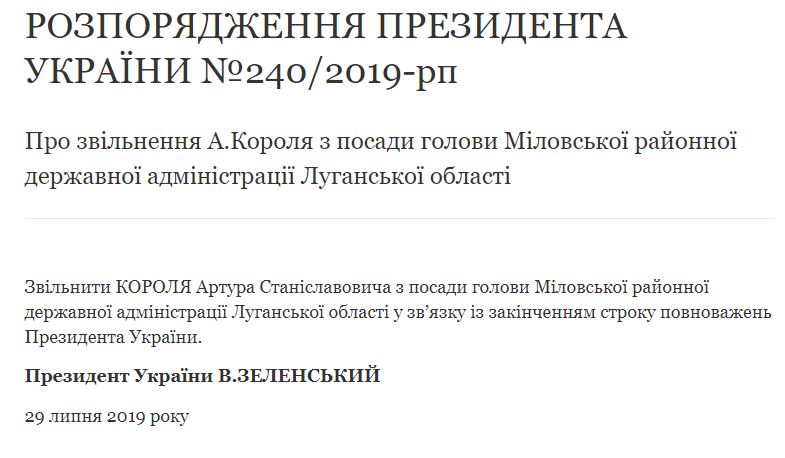 "Уволить Короля Артура Станиславовича от должности председателя Миловской районной государственной администрации Луганской области в связи с окончанием срока полномочий Президента Украины", - говорится в сообщении.