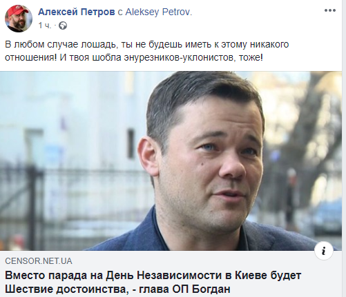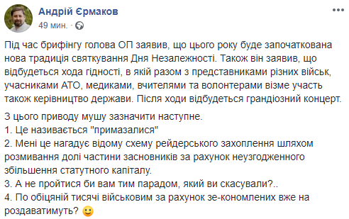 "Ну что ж. Зеленский решил гибридно выйти из ситуации с отменой парада. Фактически президент после многочисленных потоков критики был вынужден дать заднюю. Парад в какой форме будет, только для того, чтобы не признавать свое поражение в АП решили назвать его маршем достоинства.