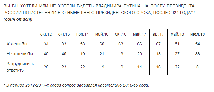 При этом, по данным социологов, на несколько процентов увеличилось количество сторонников Путина, по сравнению с маем 2018 года. Впрочем, это один из низших показателей, начиная с ноября 2014 года. При этом тех, кто Путина видеть президентом не хотел бы, было больше только в октябре 2012 и 2013 годов, после этого данный показатель был значительно меньше.