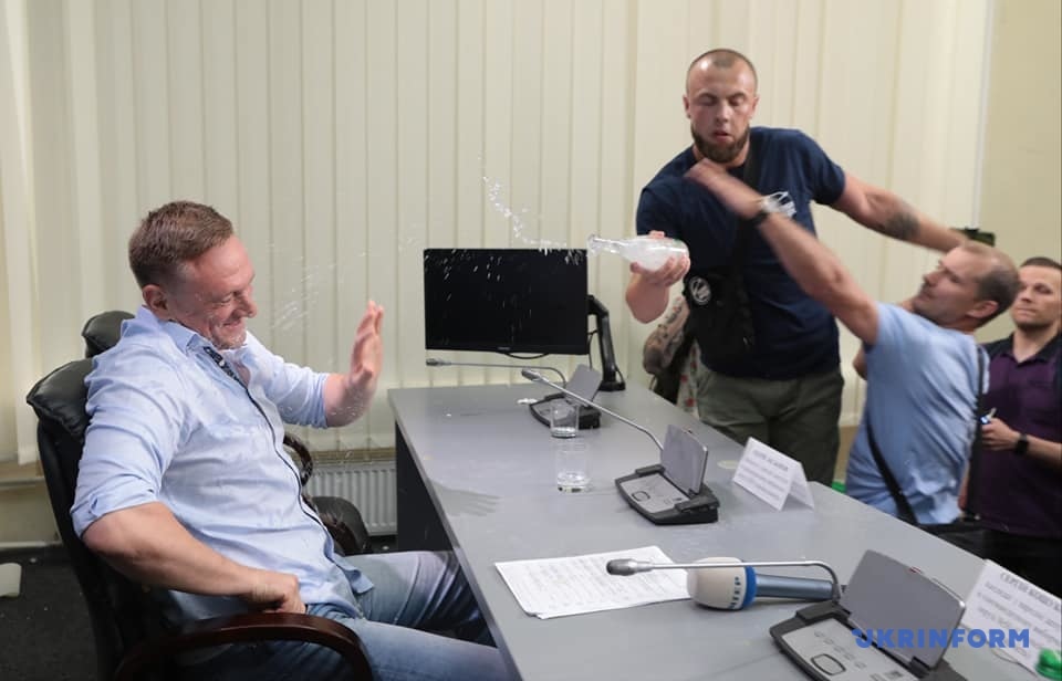Напомним, во вторник, 30 июля, в Укринформе молодчики в футболках организации "Традиция и порядок" сорвали пресс-конференцию, посвященную возможным фальсификациям в округе №50 в Покровске в Донецкой области. В частности, они во время пресс-конференции выбили входную дверь в зал Укринформа и вбежали с криками "Сепаратист Аксенов!", "Ганьба", после чего облили водой и забросали яйцами кандидата в депутаты Андрея Аксенова.