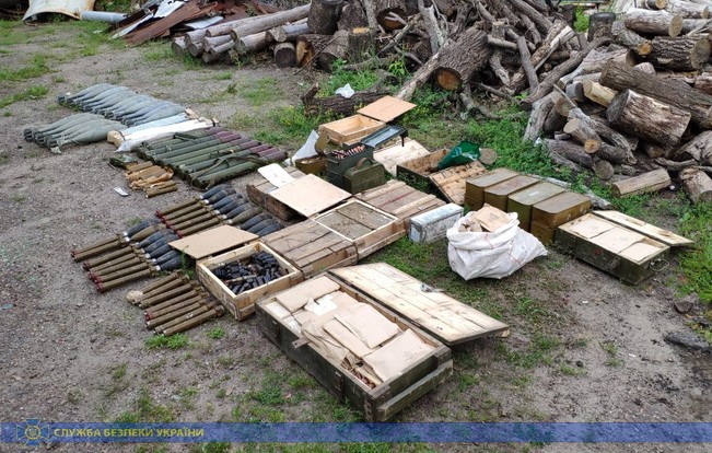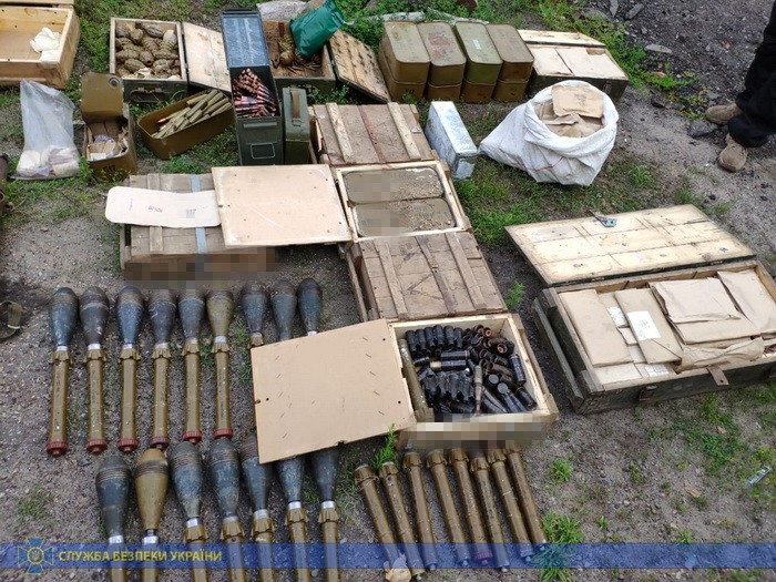 Во время обыска изъяли 16 минометных мин ОФ-36 калибра 120 мм (запрещённых Минскими соглашениями), 11 ручных противотанковых гранатометов РПГ-22, 3 ручных кумулятивных гранаты РКГ-37, 66 гранат ВОГ-17 к автоматическому гранатомету, противопехотную направленную мину МОН-50, 44 гранаты Ф-1 и РГД-5, 12 ящиков с патронами различного калибра, заряды к минам, взрыватели и самодельные взрывные устройства.
