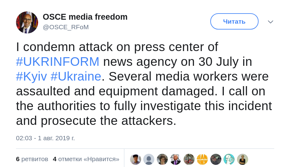 "Я осуждаю нападение на пресс-центр информационного агентства "Укринформа" 30 июля в Киеве. Несколько работников СМИ подверглись нападению, а оборудование повреждено. Я призываю власти полностью расследовать этот инцидент и привлечь к ответственности нападавших", - сказано в сообщении.
