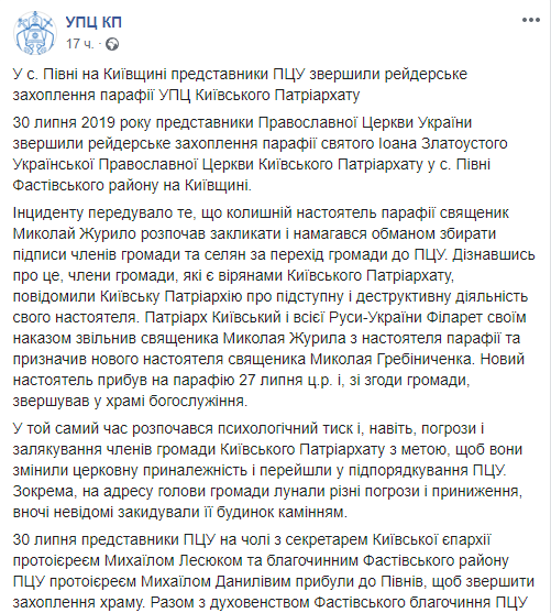 Также поясняется, что 30 июля представители ПЦУ прибыли в Петухов, чтобы совершить захват храма. Вместе с духовенством в село привезли около 100 человек, которые не являются членами общины, постоянными прихожанами и даже жителями Петухов. Представители ПЦУ, без участия приходской общины, провели свои собрания и образовали новую общину ПЦУ.