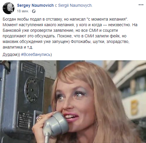 "Богдан якобы подал в отставку, но написал "с момента желания". Момент наступления какого желания, у кого и когда - неизвестно. На Банковой уже опровергли заявление, но все СМИ и соцсети продолжают это обсуждать. Похоже, что в СМИ залили фейк, но маховик обсуждения уже запущен) Фотожабы, шутки, злорадство, аналитика и т.д. Дурдом)" - написал юрист и блогер Сергей Наумович.