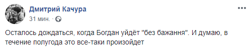 "Осталось дождаться, когда Богдан уйдёт "без бажання". И думаю, в течение полугода это все-таки произойдет", - пишет Дмитрий Качура.