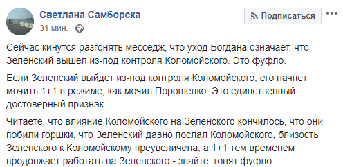 "Сейчас кинутся разгонять месседж, что уход Богдана означает, что Зеленский вышел из-под контроля Коломойского. Это фуфло.