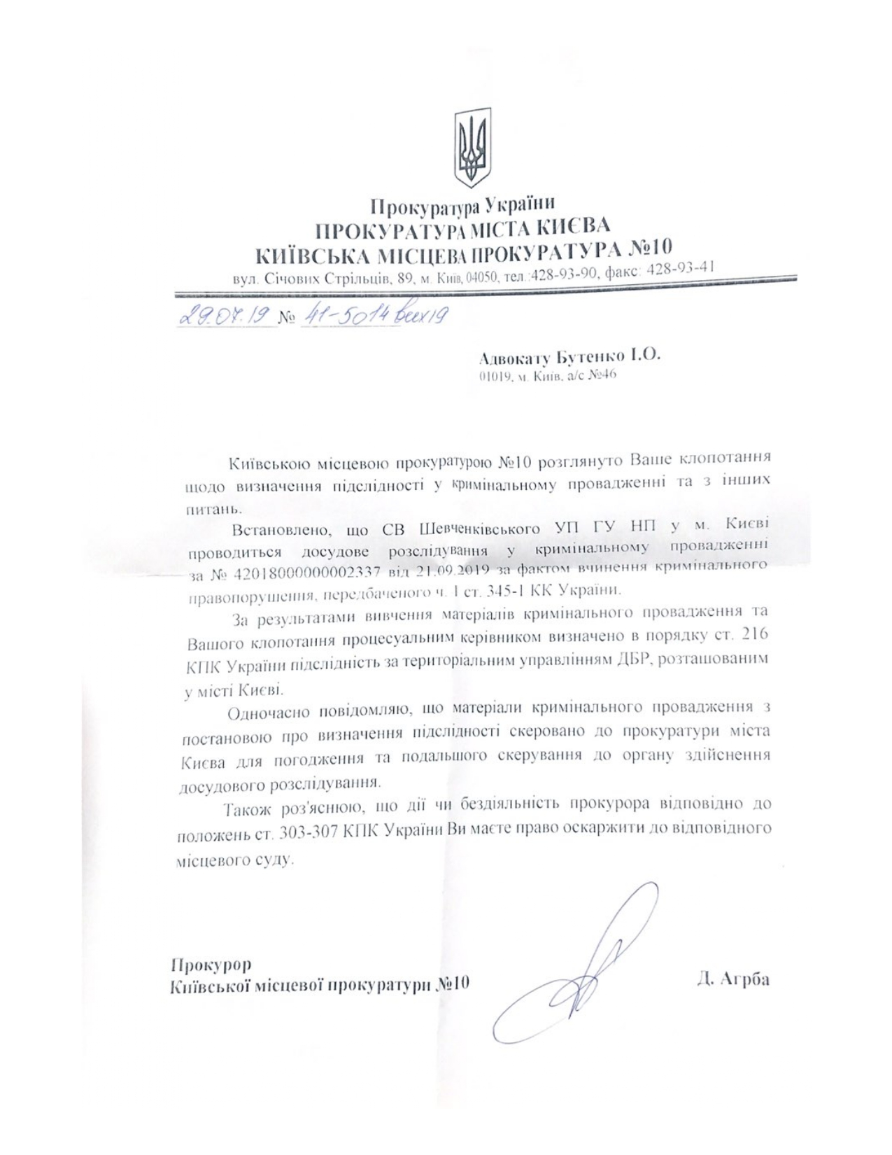 Об этом свидетельствует письмо прокуратуры города Киева.