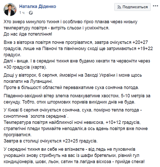 В Украину идет потепление: со вторника воздух начнет прогреваться все больше, а в середине недели уже ожидается жара. Такой прогноз дает на своей странице в Facebook синоптик Наталья Диденко.