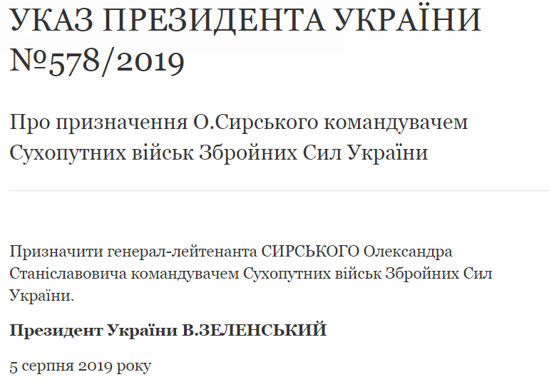 Вместо уволенного командующего Зеленский назначил на эту должность Александра Сырского. Новому назначению посвящен указ под №578/2019.