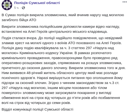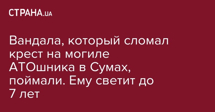 Вандала, который сломал крест на могиле АТОшника в Сумах, поймали. Ему светит до 7 лет